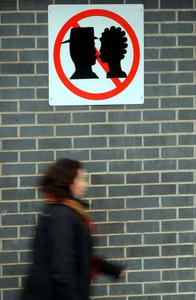 英チェシャー州のウォリントン・バンクキー駅が導入した、別れのキスを禁止する「ノー・キッシング(キス禁止)」の標識。別れを惜しむカップルの抱擁による列車の遅れや、車の渋滞を防ぐためだという