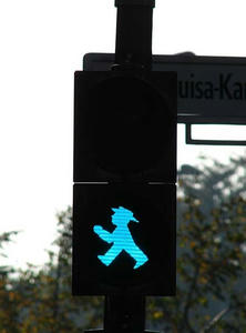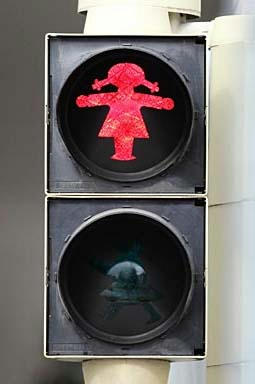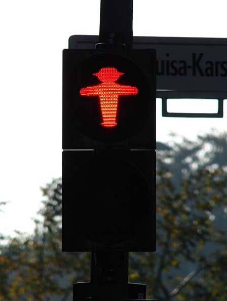 ドイツ南西部ゾントホーフェンの歩行者用信号機。このたび同市の数カ所の信号のマークが、女性の姿をデザインしたものに取り替えられた。旧東独の信号の人型マーク「アンペルマン」の女の子版だ。かつて旧東西ドイツでは、異なるデザインの信号が使用されていたが、女性のマークはなかったという