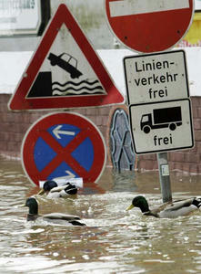ドイツ北部ラウエンブルク。「進入禁止」の交通標識をよそに、川のはんらんで水のあふれた道路の上を悠然と泳ぐ3羽のアヒル。雪解けなどによる増水で水位は記録的な高さまで上昇した