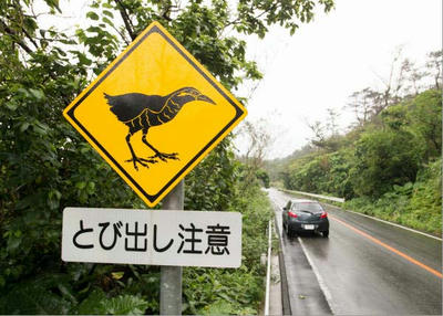国道58号線沿いに設置された「ヤンバルクイナとび出し注意」の標識