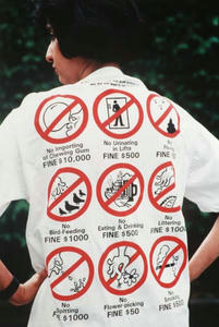 シンガポール国内で禁止されている行為と、違反した場合の罰金をプリントしたTシャツ