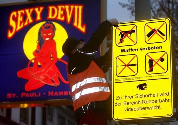 ドイツ北部ハンブルク市のレーパーバーンに設置された、銃やナイフ持ち込み禁止の標識。市当局は、市内にある合法的な売春地区で観光名所でもあるレーパーバーンに銃やナイフを持ち込むことを禁止。犯罪激増に対応するための措置という