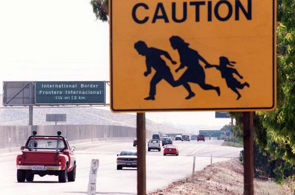 アメリカ・メキシコ国境のハイウエー脇に立つ道路標識。道路を横断するメキシコ人密入国者たちへの注意を喚起する警告