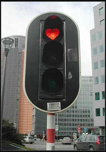 ベルギー・ブリュッセルにある欧州連合(EU)本部(画面中央の建物)前のハート型の赤信号