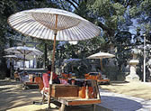 参道を挟むように左右に並ぶ5軒の飴屋。大きな傘を広げた古風な姿で参拝客を迎える五人百姓は、境内での営業を唯一許された由緒あるお店です。