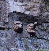 奥社の西側、垂直に切り立った岩壁の上方に、荒々しい表情の天狗面が掲げられています。これは苦行に明け暮れた修験者達の天狗信仰によるもので、古の修験道の跡を今にとどめています。