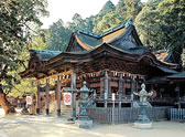ひときわ華麗な二層入母屋造の社殿には、屋根裏、柱、扉など至る所に天保美術の粋を集めた彫刻がほどこされ、完成まで約40年の歳月を要したといわれています。また、楼上に掲げられている「降神観」の3字の額は、清国第一級の書家として知られる王文治の筆になるもので、江戸の戯作者十返舎一九が、「こんぴら道中膝栗毛」のなかにこの額を見たと記してあることでも有名です。