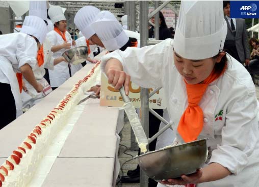 都内で17日、世界一長いロールケーキのギネス世界記録に挑戦するイベントが行われた。パティシエと専門学校の生徒約90人が参加。小麦粉54キロ、砂糖43キロ、卵2682個を使って完成させたロールケーキの長さは130メートル68センチ。これまでの記録115メートル9センチを抜き、見事にギネス記録に認定された(2013年4月17日撮影)。(c)AFP/Yoshikazu TSUNO