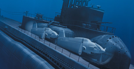 防水型格納庫に搭載された爆撃機2機は潜水艦浮上後、